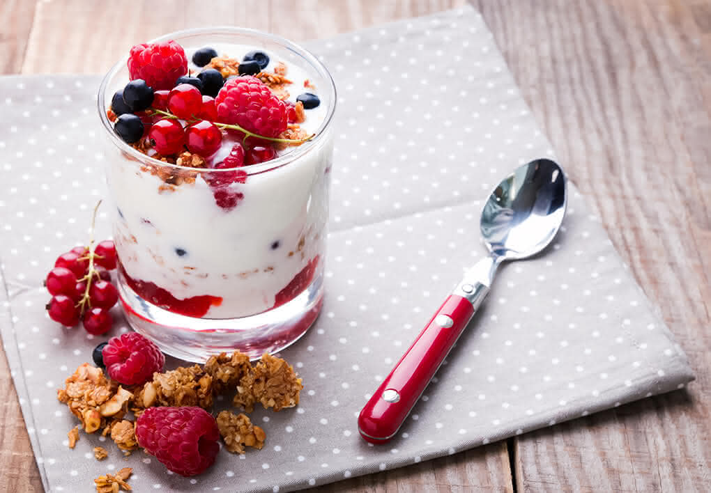 Нежный ягодный трайфл с клубничным йогуртом, гранолой, семенами чиа и льна