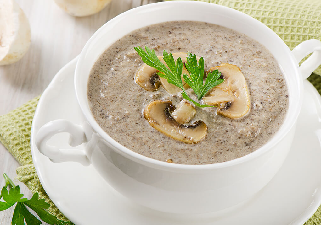 Суп-пюре на курячому бульйоні з картоплею, грибами різних сортів, сметаною, сиром і зеленню